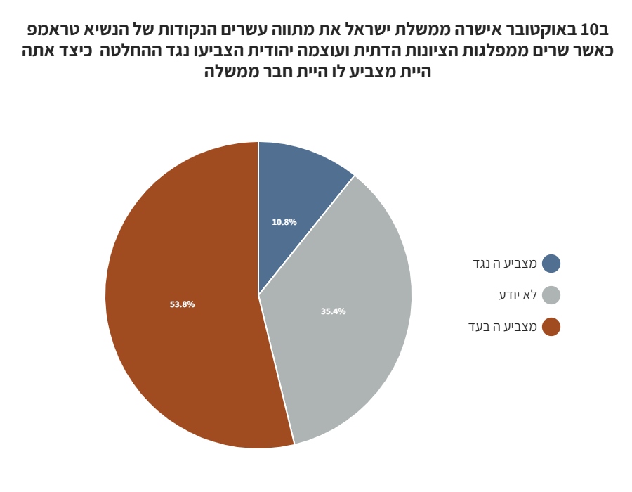 54% השיבו כי היו מצביעים בעד אישור מתווה עשרים הנקודות של הנשיא טראמפ, לעומת 11% שהשיבו כי היו מצביעים נגד החלטה זו. 35% השיבו כי אינם יודעים.