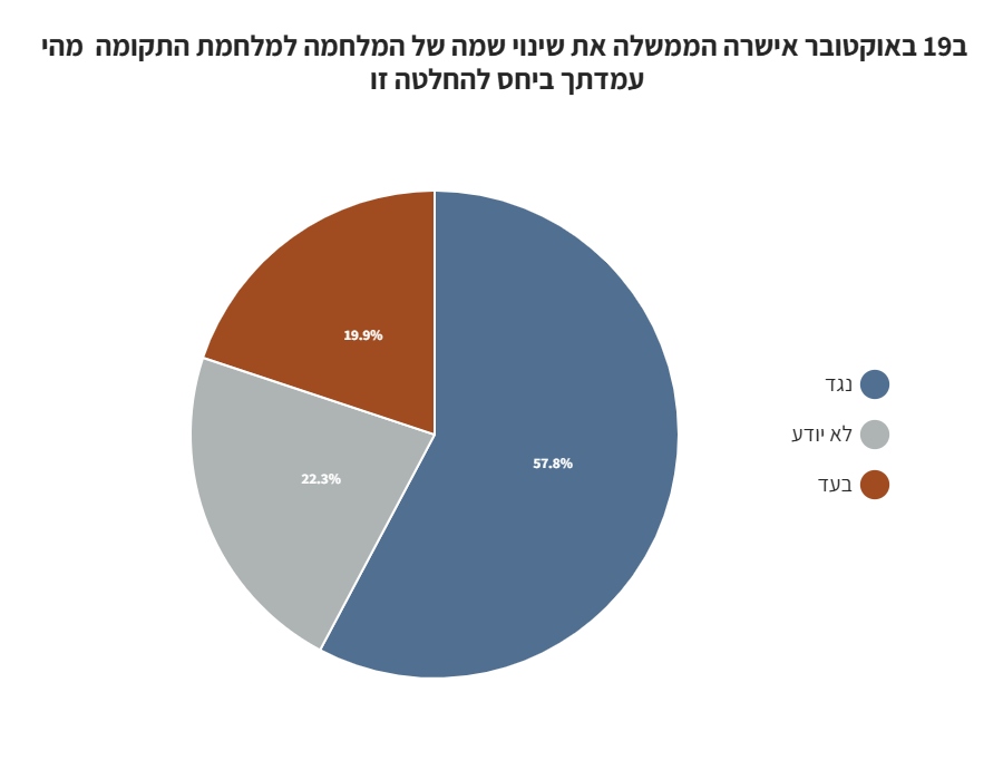 58% השיבו כי הם נגד החלטת הממשלה לשינוי שם המלחמה ל'מלחמת התקומה', לעומת 20% שהשיבו כי הם בעד החלטה זו. 22% השיבו שאינם יודעים.