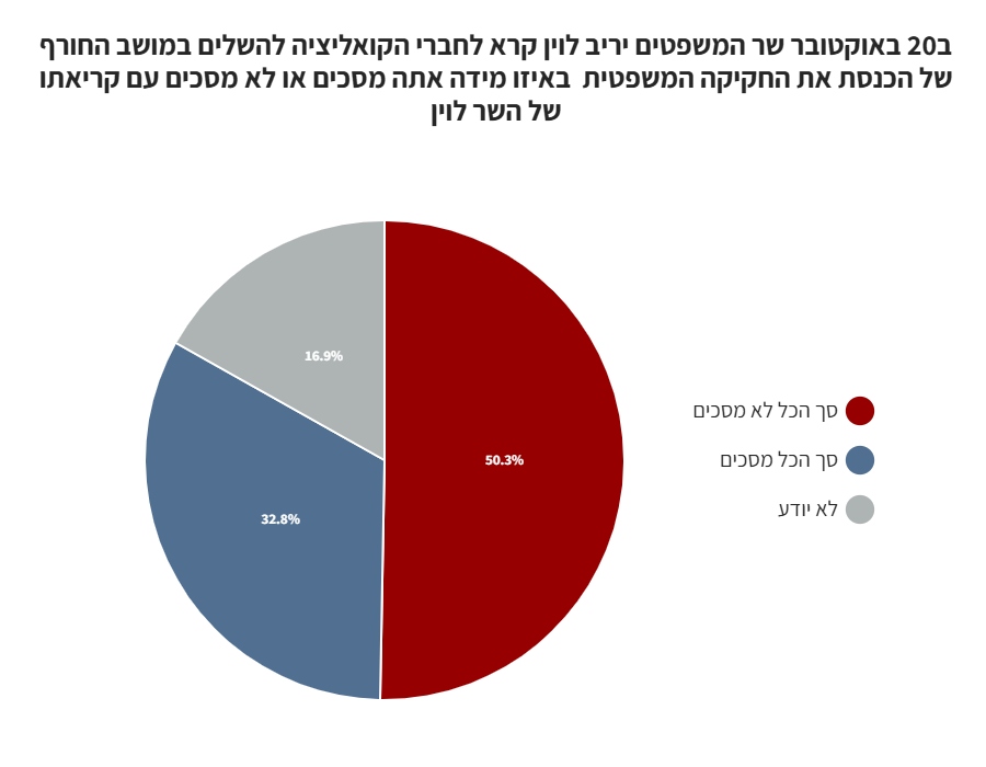 כשליש מהמשיבים מסכימים עם קריאתו של שר המשפטים יריב לוין להשלמת החקיקה המשפטית, לעומת מחצית מהציבור שאינם מסכימים עם קריאתו.