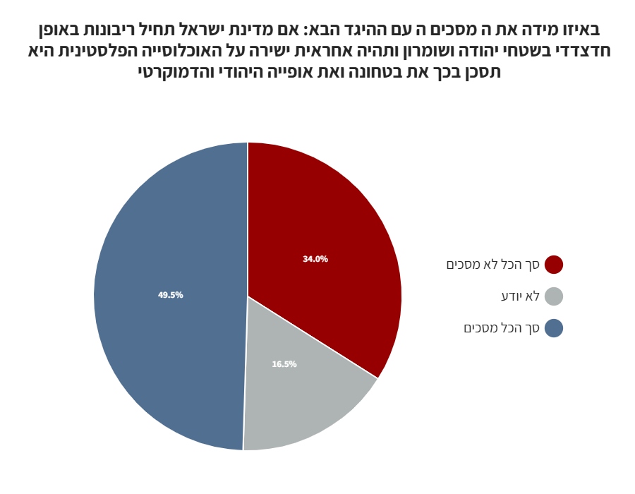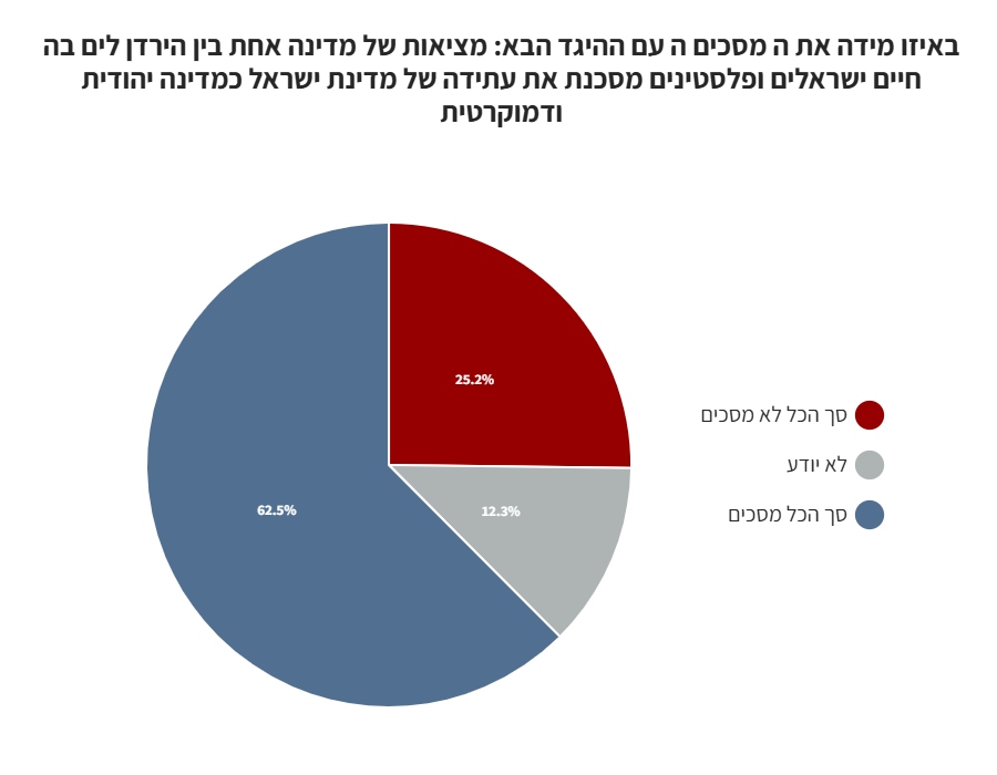 63% מסכימים עם כך שמציאות של מדינה אחת בין הירדן לים בה חיים ישראלים ופלסטינים מסכנת את עתידה של מדינת ישראל כמדינה יהודית ודמוקרטית.