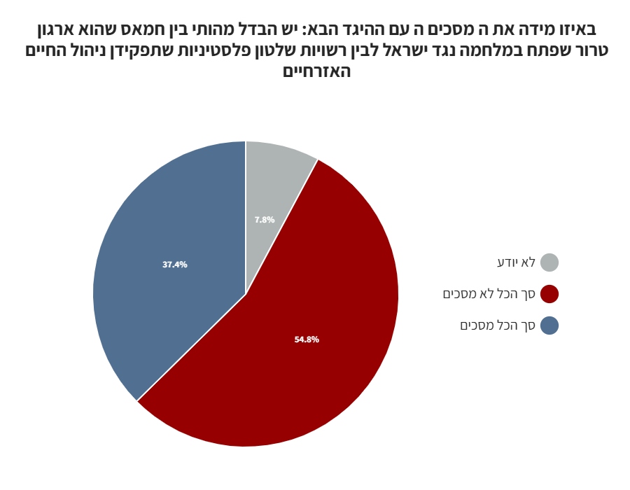 55% לא מסכימים שיש הבדל מהותי בין חמאס שהוא ארגון טרור שפתח במלחמה נגד ישראל לבין רשויות שלטון פלסטיניות שתפקידן ניהול החיים האזרחיים.