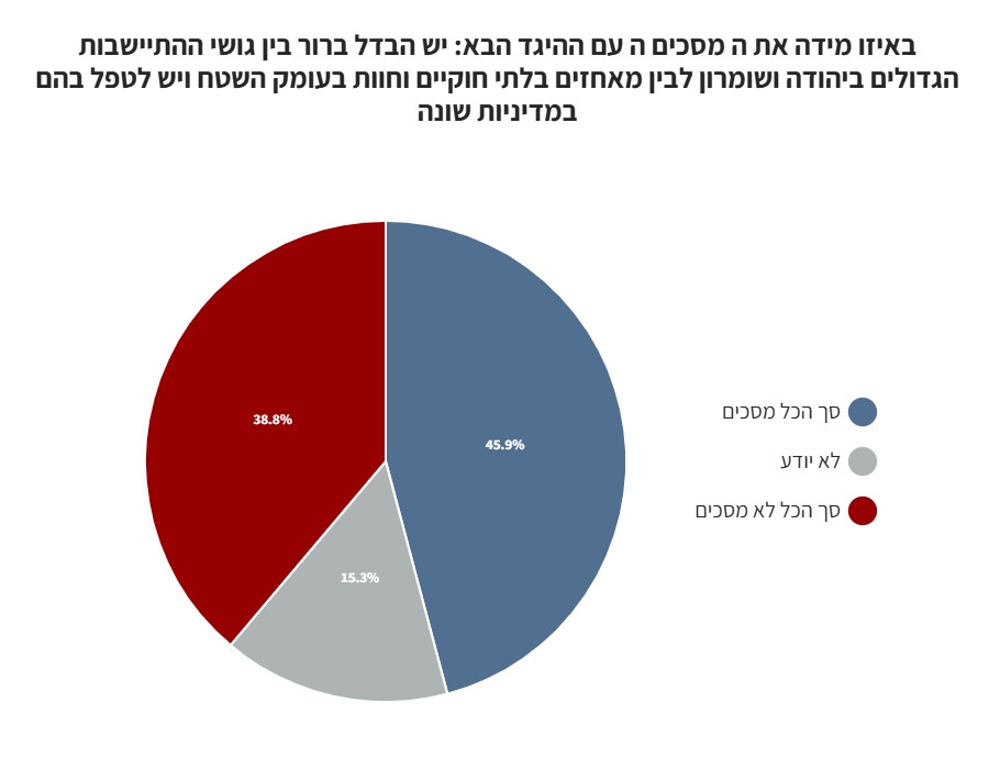 46% מסכימים שיש הבדל ברור בין גושי ההתיישבות הגדולים ביהודה ושומרון לבין מאחזים בלתי חוקיים וחוות בעומק השטח, ויש לטפל בהם במדיניות שונה.