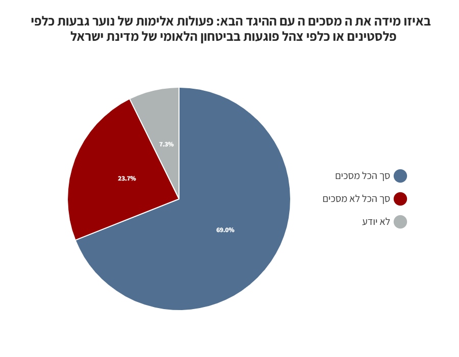 69% מסכימים שפעולות אלימות של נוער גבעות כלפי פלסטינים או כלפי צה"ל פוגעות בביטחון הלאומי של מדינת ישראל.