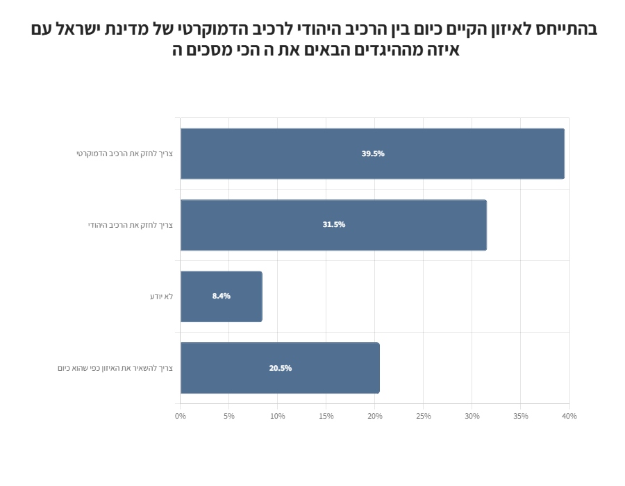 כ-40% מהמשיבים סבורים כי יש לחזק את הרכיב הדמוקרטי של מדינת ישראל, אל מול כ-32% שסבורים כי יש לחזק את הרכיב היהודי. 21% סבורים כי יש להשאיר את האיזון כפי שהוא קיים היום.
