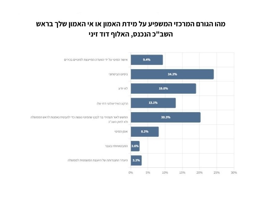 הגורמים המרכזיים שמשפיע על מידת האמון או אי האמון בראש השב"כ הנכנס הם ניסיונו הביטחוני (24%), החשש לאור תצהירי בר לבג"ץ שהמינוי נעשה כדי להבטיח נאמנות לראש הממשלה ולא לחוק השב"כ (20%), והרקע האידיאולוגי-דתי שלו (13%). 19% השיבו שהם אינם יודעים.