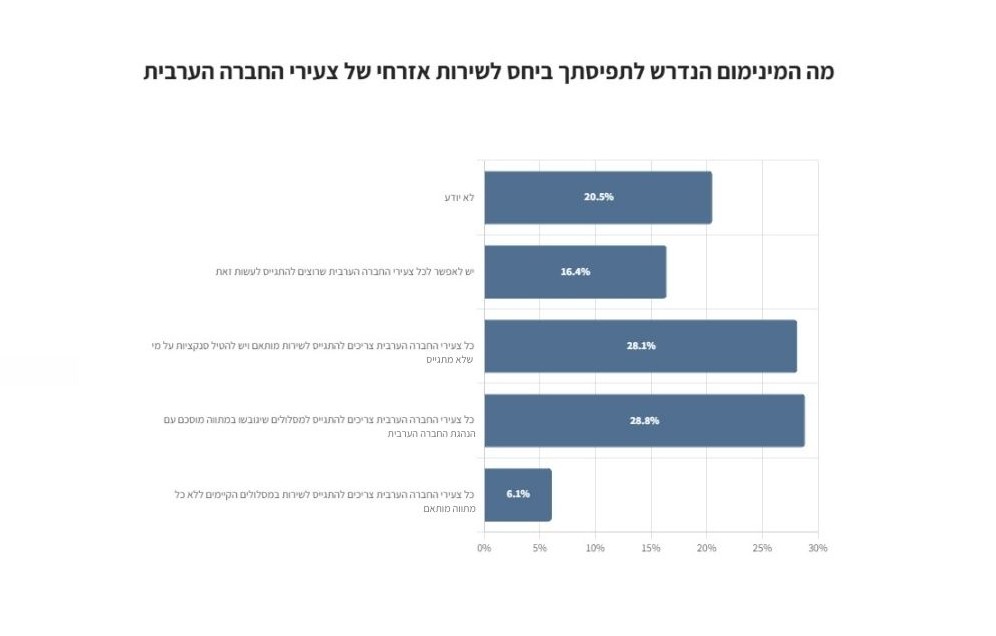 29% סבורים כי כל צעירי החברה הערבית צריכים להתגייס למסלולים שגובשו במתווה מוסכם עם הנהגת החברה הערבית, 28% סבורים כי כל צעירי החברה הערבית צריכים להתגייס לשירות מותאם ויש להטיל סנקציות על מי שלא מתגייס, ו-16% סבורים כי יש לאפשר לכל צעירי החברה הערבית שרוצים להתגייס – לעשות זאת. 21% השיבו שאינם יודעים.