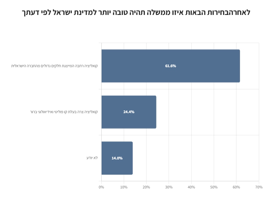 62% מהמשיבים סבורים כי קואליציה רחבה המייצגת חלקים גדולים מהחברה הישראלית תהיה טובה יותר למדינת ישראל.