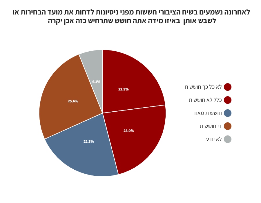 48% השיבו כי הם חוששים במידה כזו או אחרת מפני ניסיונות לדחיית מועד הבחירות או שיבושן, לעומת 46% שהשיבו כי הם אינם חוששים מתרחיש שכזה.