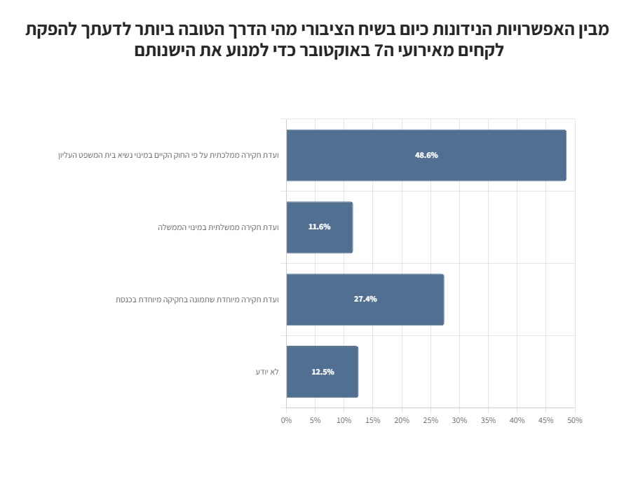 49% סבורים כי יש להקים ועדת חקירה ממלכתית על פי החוק הקיים במינוי נשיא בית המשפט העליון, 27% סבורים כי יש להקים ועדת חקירה מיוחדת שתמונה בחקיקה מיוחדת בכנסת ו-12% סבורים כי יש להקים ועדת חקירה ממשלתית במינוי הממשלה. 13% השיבו כי אינם יודעים.