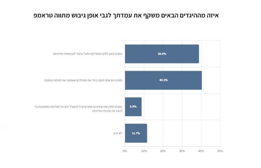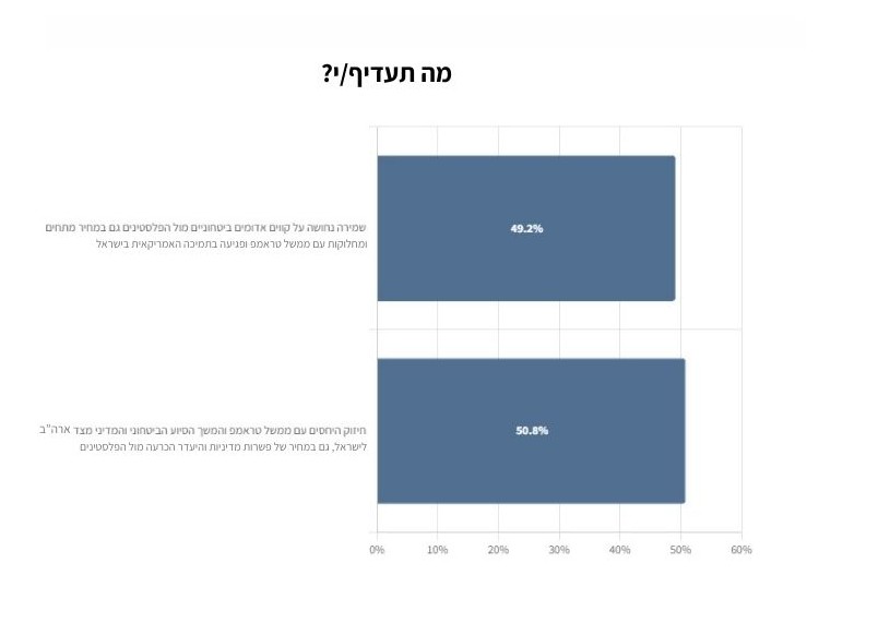 51% מעדיפים את חיזוק היחסים עם ממשל טראמפ והמשך הסיוע הביטחוני והמדיני מצד ארה"ב לישראל, גם במחיר של פשרות מדיניות והיעדר הכרעה מול הפלסטינים, לעומת 50% שמעדיפים שמירה נחושה על קווים אדומים ביטחוניים מול הפלסטינים, גם במחיר מתחים ומחלוקות עם ממשל טראמפ ופגיעה בתמיכה האמריקאית בישראל.
