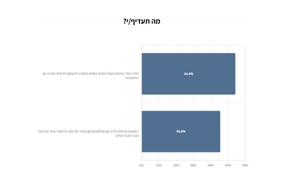 54% מעדיפים הסדר אזורי והרחבת מעגל הסכמי השלום בתמורת להעמקת הדיאלוג המדיני עם הפלסטינים, לעומת 46% שמעדיפים הימנעות מדיאלוג מדיני עם הפלסטינים גם במחיר של וויתור על הסדר אזורי והרחבת מעגל הסכמי השלום.