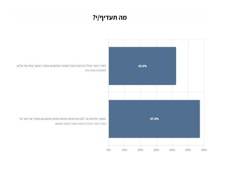 58% מעדיפים את המשך הלחימה עד להכרעה מלאה ומיטוט שלטון חמאס, גם במחיר של וויתור על הסדר אזורי הכולל הרחבת מעגל הסכמי השלום, לעומת 43% שמעדיפים הסדר אזורי הכולל הרחבת מעגל הסכמי השלום, גם במחיר המשך קיומו של שלטון חמאס ברצועת עזה.