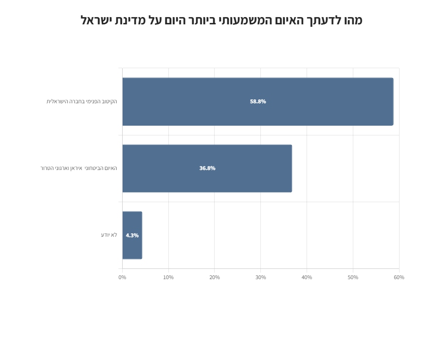 59% מהמשיבים סבורים כי הקיטוב הפנימי בחברה הישראלית הוא האיום המשמעותי ביותר היום על מדינת ישראל.