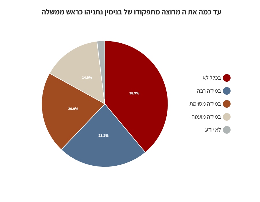 54% השיבו שאינם מרוצים במידה כזו או אחרת מתפקודו של בנימין נתניהו כראש ממשלה, לעומת 44% שהשיבו שהם מרוצים מתפקודו.