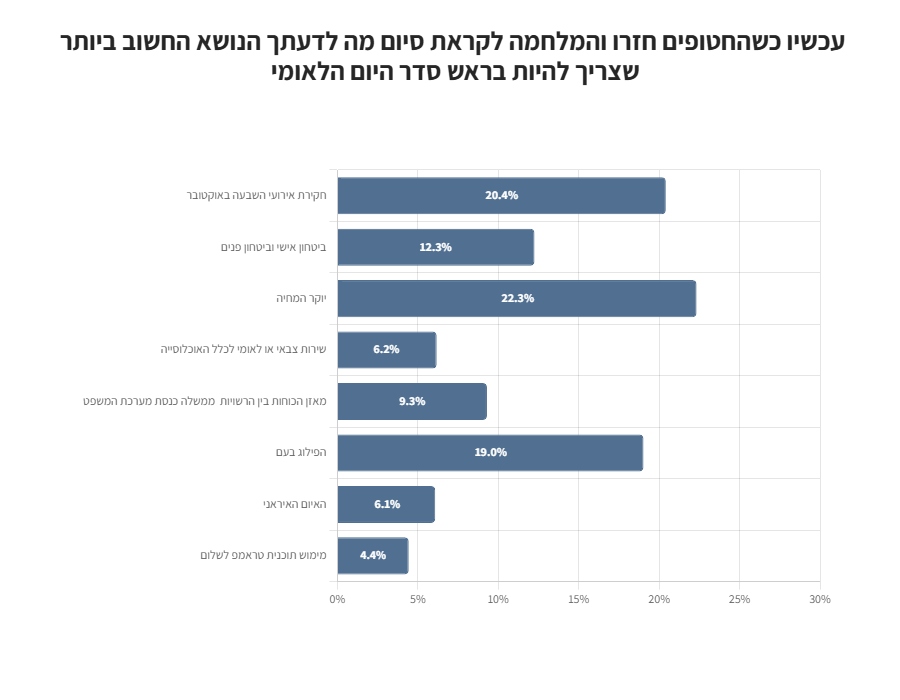 כעת, כשהחטופים חזרו והמלחמה לקראת סיום, הנושאים שצריכים להיות בראש סדר היום הלאומי הם יוקר המחיה (22%), חקירת אירועי השבעה באוקטובר (20%) והפילוג בעם (19%).