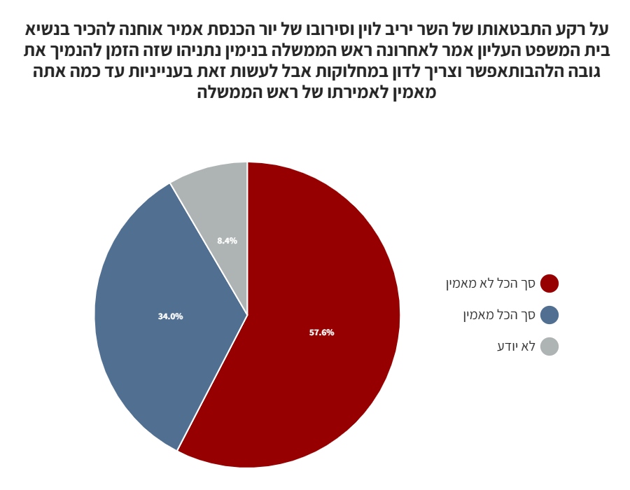 58% לא מאמינים לאמירתו של ראש הממשלה בנימין נתניהו על כך ש"זה הזמן להנמיך את גובה הלהבות… אפשר וצריך לדון במחלוקות אבל לעשות זאת בענייניות", לעומת 34% שמאמינים לאמירה זו.