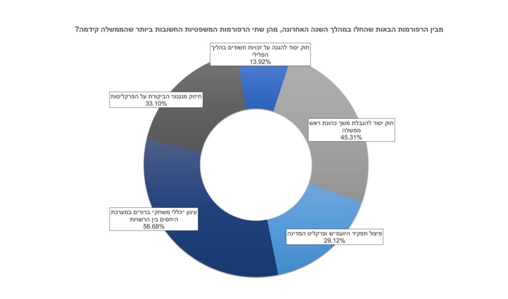במכון תכלית נערכו בשנה האחרונה מספר סקרי דעת קהל אשר בחנו את היקף התמיכה הציבורית במהלכים שונים הקשורים למערכת המשפט. בסקר שבו התבקשו הנשאלים והנשאלות לדרג את הרפורמות המשפטיות החשובות ביותר שיזמה ממשלת בנט-לפיד בתקופת כהונתה, דורג מהלך פיצול תפקיד היועמ״ש במקום הרביעי מתוך חמישה (29% תמיכה). הנשאלים סברו כי המהלכים לקידום הסדרת כללי המשחק בין הרשויות (57%), הגבלת משך כהונת ראש ממשלה (46%) וחיזוק מנגנוני הפיקוח על הפרקליטות (33%) חשובים יותר לקידום מערכת המשפט. בסקר שנערך בספטמבר 2022 הביעו 74% מהנשאלים תמיכה ברפורמה שתחזק את מנגנוני הפיקוח על הפרקליטות.