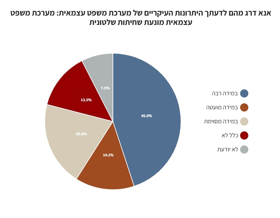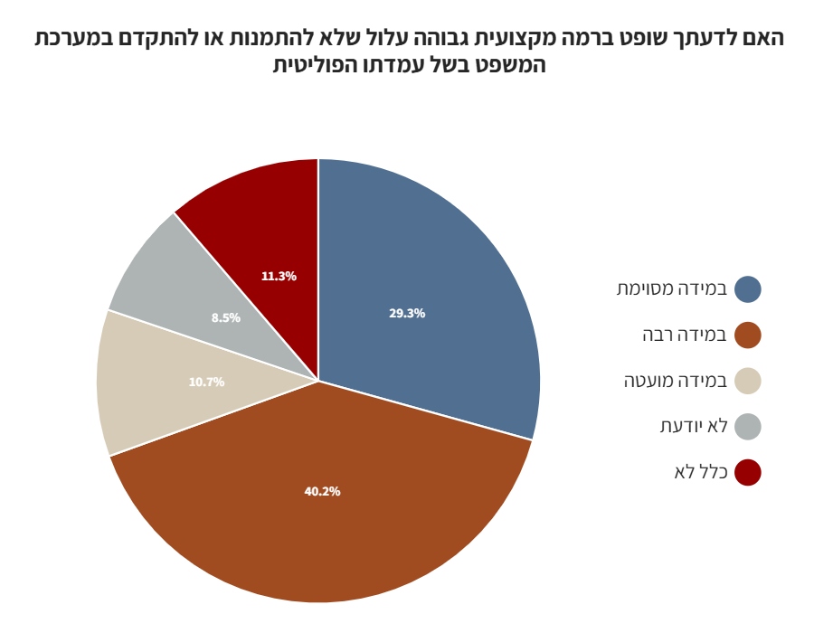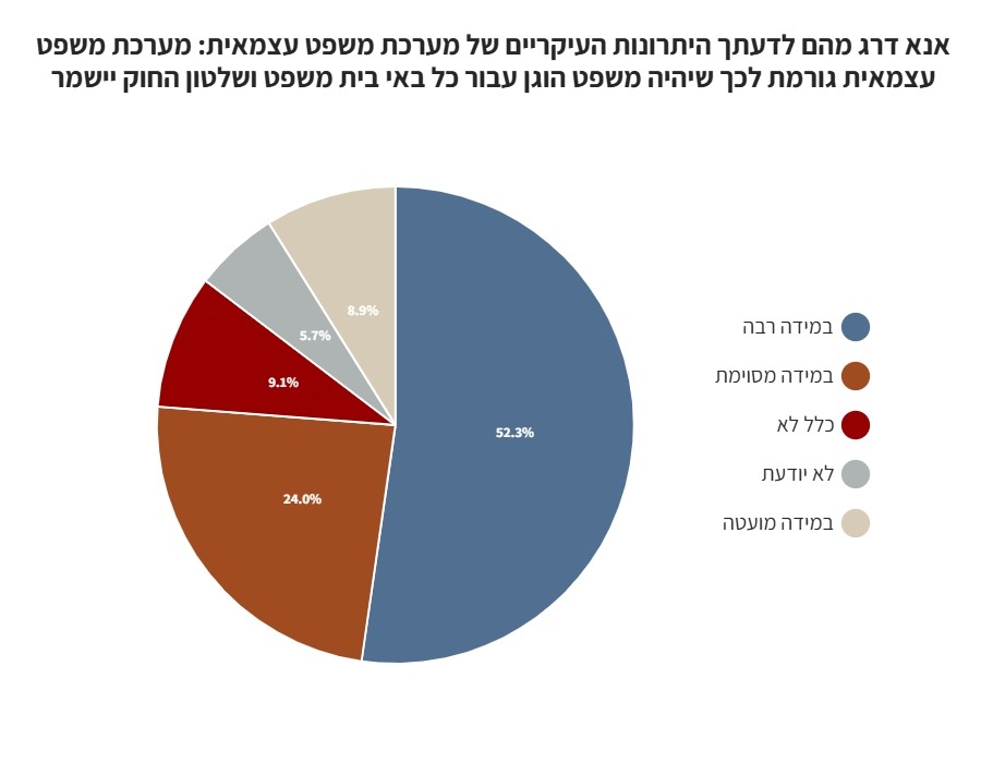על רקע הקיטוב, הפוליטיזציה וקרב הזהויות שהשתלט על השיח בישראל, בחנו את עמדות הציבור ביחס לאמון במערכת המשפט. הסקר בוצע באינטרנט באמצעות הפאנל האינטרנטי Panel4All ב-13 באוגוסט, 2025. הסקר בוצע בקרב 500 מרואיינים המהווים מדגם מייצג של האוכלוסייה הבוגרת בישראל בגילאי 18 ומעלה. טעות הדגימה המרבית 4%+-.