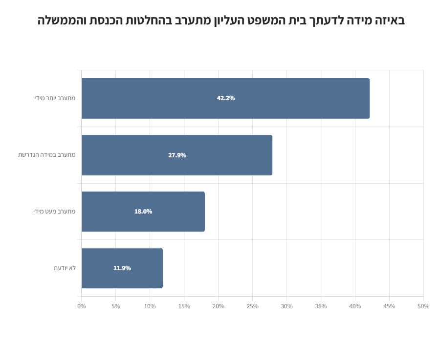 כ-42% מהנשאלים השיבו כי לדעתם בית המשפט העליון מתערב יותר מדי בהחלטות הכנסת והממשלה, לעומת כ-46% מהנשאלים שהשיבו כי בעיניהם בג"צ מתערב מעט מידי או במידה הנדרשת בהחלטות הממשלה והכנסת.