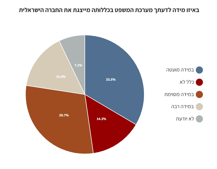 כ-48% מהנשאלים השיבו כי מערכת המשפט בכללותה אינה מייצגת את החברה הישראלית.