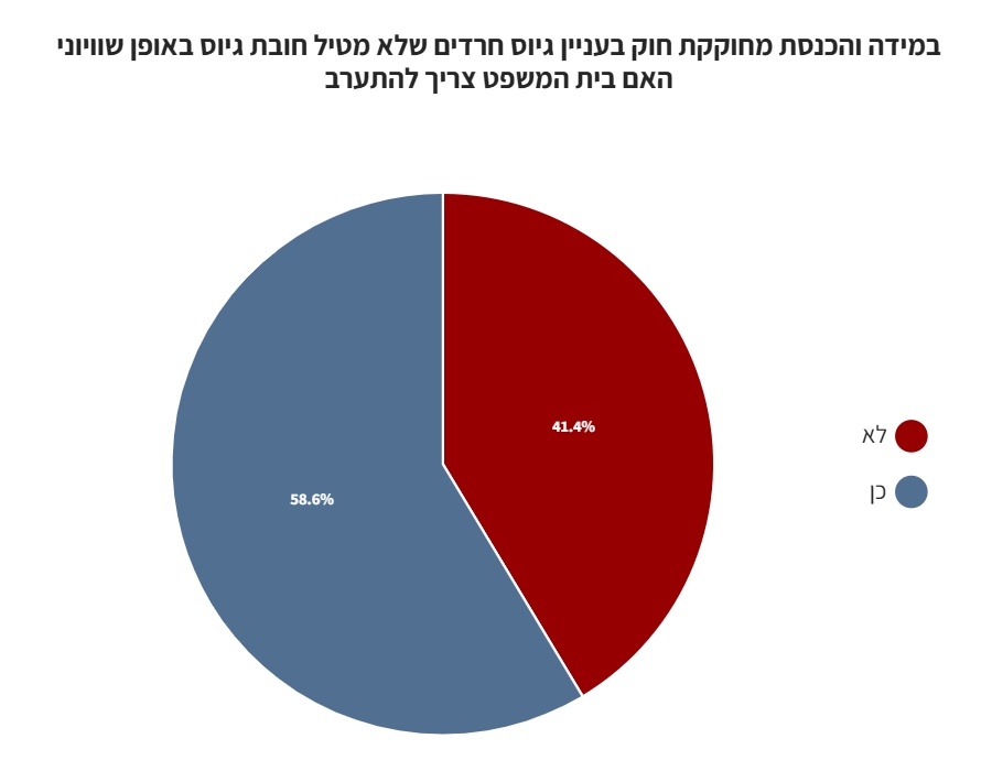 כ-58% מהנשאלים השיבו כי לדעתם על בג"ץ להתערב במקרה והכנסת תחוקק חוק שאינו מטיל חובת גיוס שוויוני.