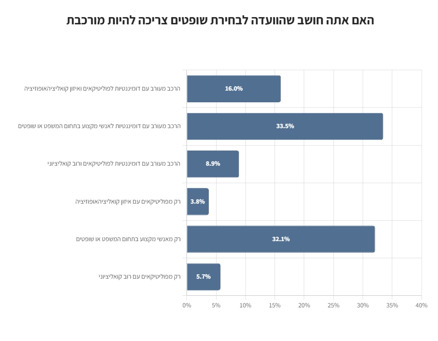 כ-34% מהמשיבים סבורים כי הוועדה לבחירת שופטים צריכה לכלול הרכב מעורב עם דומיננטיות לאנשי מקצוע בתחום המשפט או שופטים, לצד 32% שסבורים כי הוועדה צריכה להיות מורכבת רק מאנשי מקצוע בתחום המשפט.