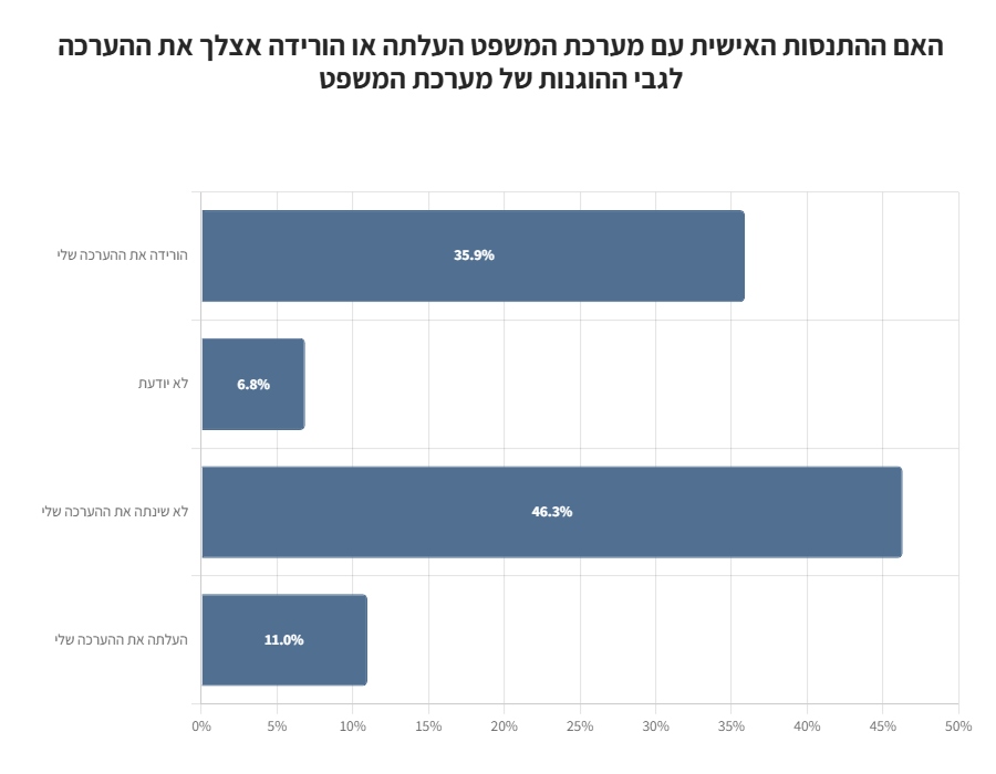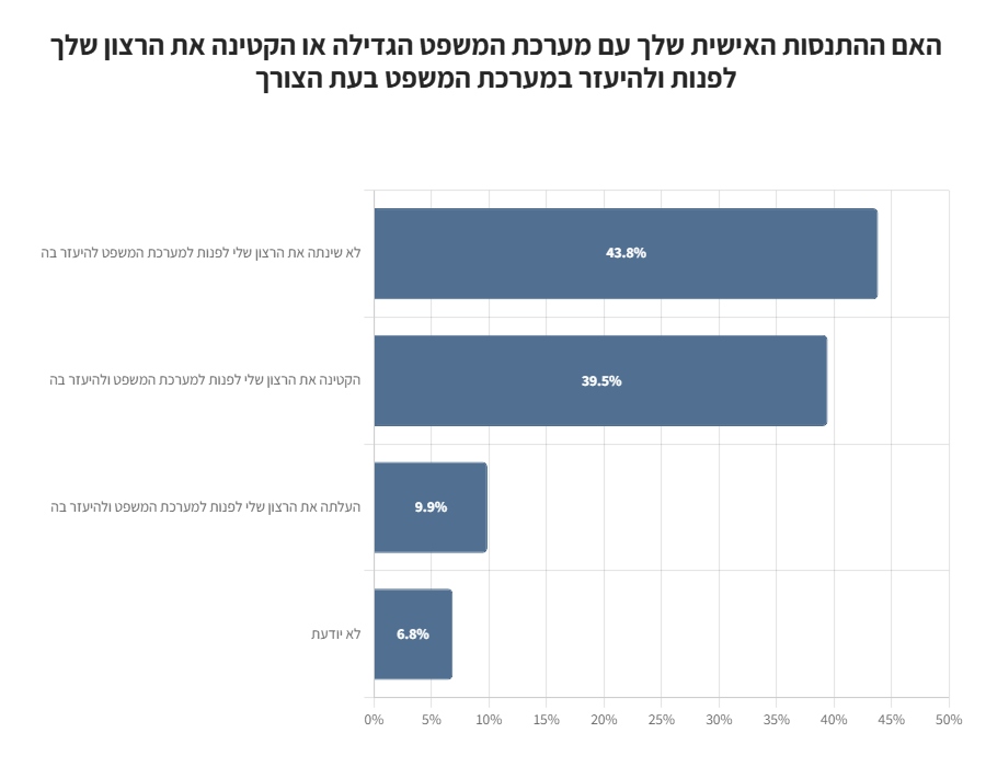 כ-40% השיבו כי ההתנסות האישית שלהם מול מערכת המשפט הפחיתה בהם את הרצון לפנות ולהיעזר בה בעתיד.