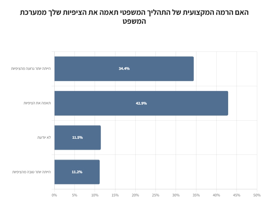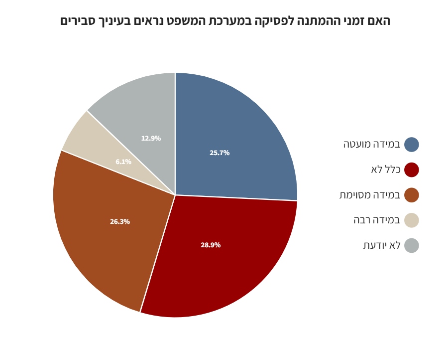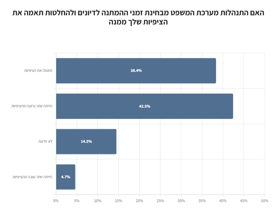 כ-43% השיבו התנהלות מערכת המשפט מבחינת זמני המתנה לדיונים ולהחלטות, הייתה יותר גרועה מהציפיות שלהם, לעומת 38% שדיווחו כי התנהלות המערכת תאמה את ציפיותיהם.