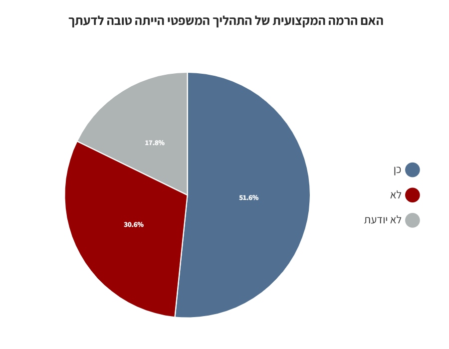 מעל 70% מאלו שניהלו משפט, סבורים כי הרמה המקצועית של התהליך המשפטי הייתה טובה.