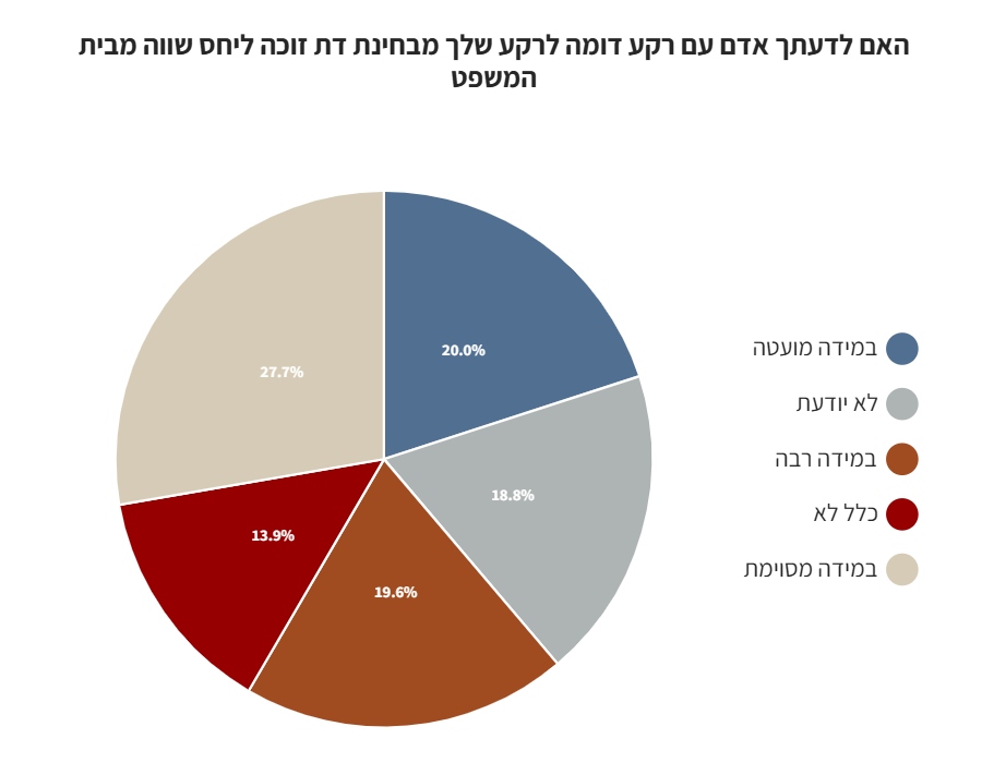 כ-48% מהנשאלים השיבו כי לדעתם, אדם בעל רקע דתי דומה זוכה ליחס שווה מבית המשפט.