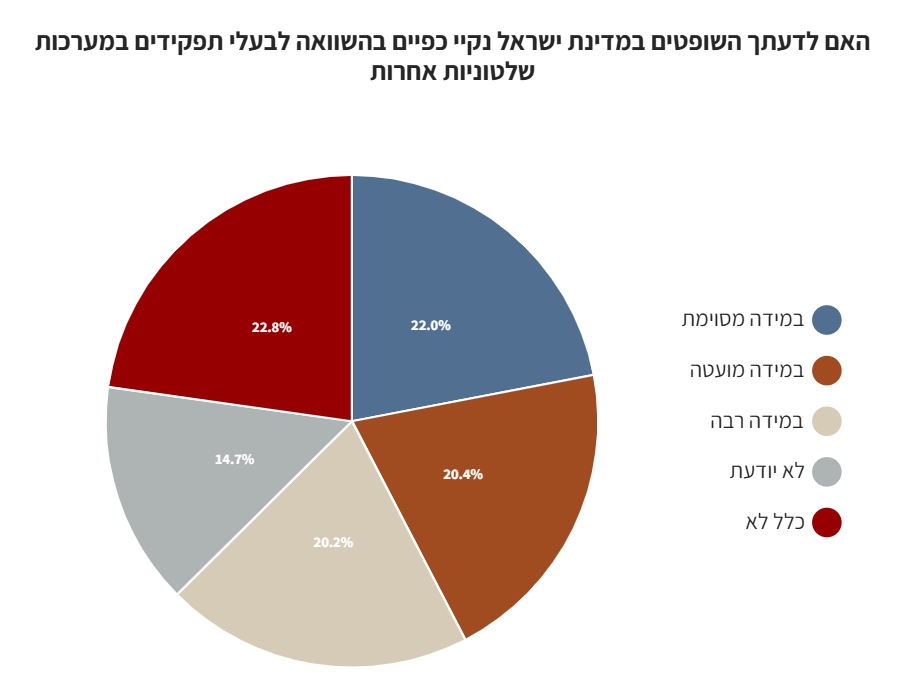 כ-45% מהנשאלים השיבו כי אינם מסכימים או מסכימים במידה מועטה עם ההיגד כי השופטים נקיי כפיים ביחס לשאר בעלי התפקידים במערכת השלטון.