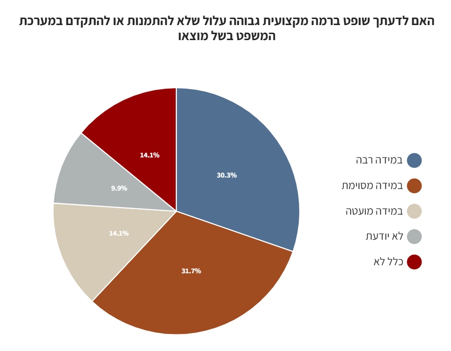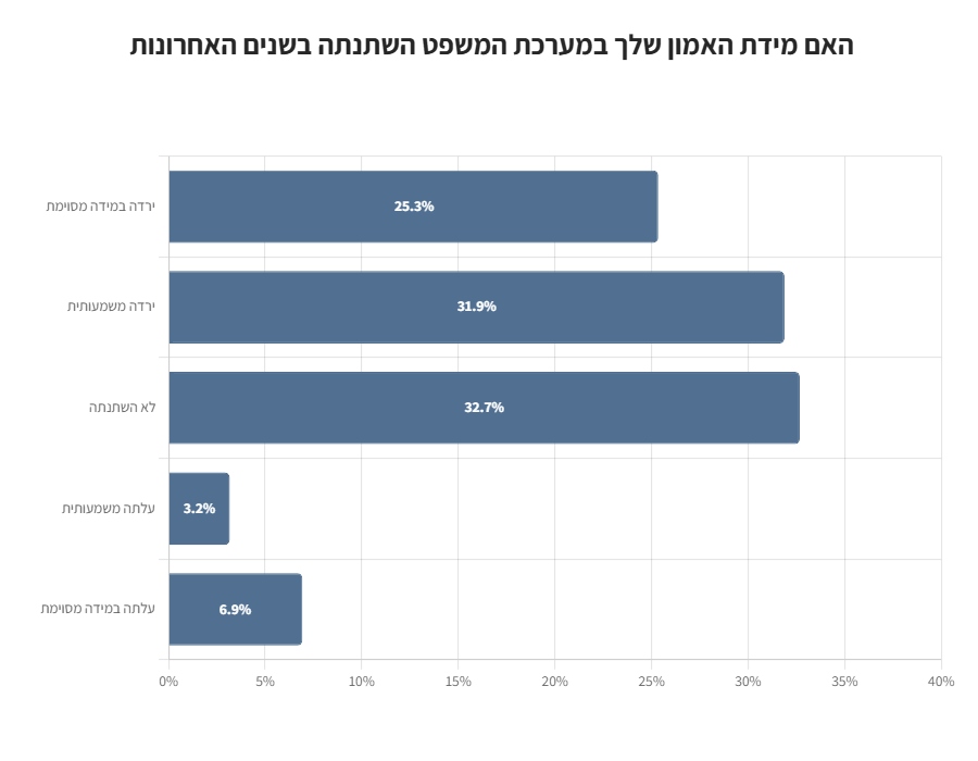 כ-57% מהנשאלים השיבו כי מידת האמון שלהם במערכת המשפט ירדה בשנים האחרונות.