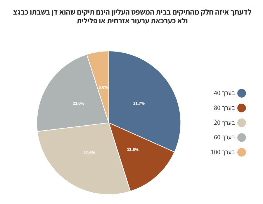 לדעת 59% מהמשיבים, רוב התיקים של בית המשפט העליון, אינם תחת שבתו כבג"צ (כ-20%-40% מהתיקים).
