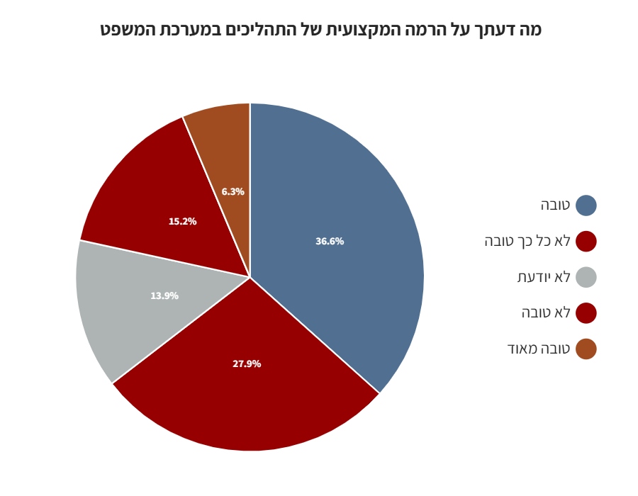 כ-42% מכלל הנשאלים השיבו כי הרמה המקצועית של מערכת המשפט טובה, בעוד כמות זהה של נשאלים השיבו כי היא אינה טובה.