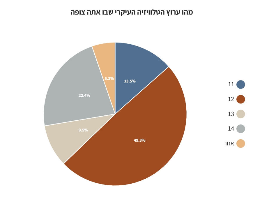 כמחצית מהמשיבים צופים בערוץ 12, לעומת 22% שצופים בערוץ 14. היתר צופים בערוץ 11 (13.5%) או בערוץ 13 (9.5%) או בערוץ אחר (5.3%).