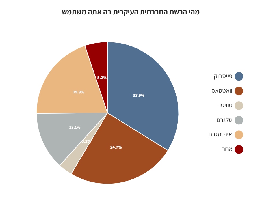משיבי הסקר משתמשים בעיקר בפייסבוק (34%), בוואטסאפ (25%) ובאינטסגרם (20%).