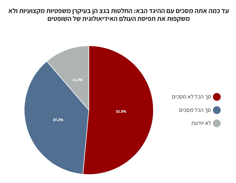 רוב הציבור (51.5%) אינו מסכים כי החלטות בג"צ הן בעיקרן משפטיות מקצועיות ולא מבוססות על תפיסת העולם האידיאולוגיות של השופטים.