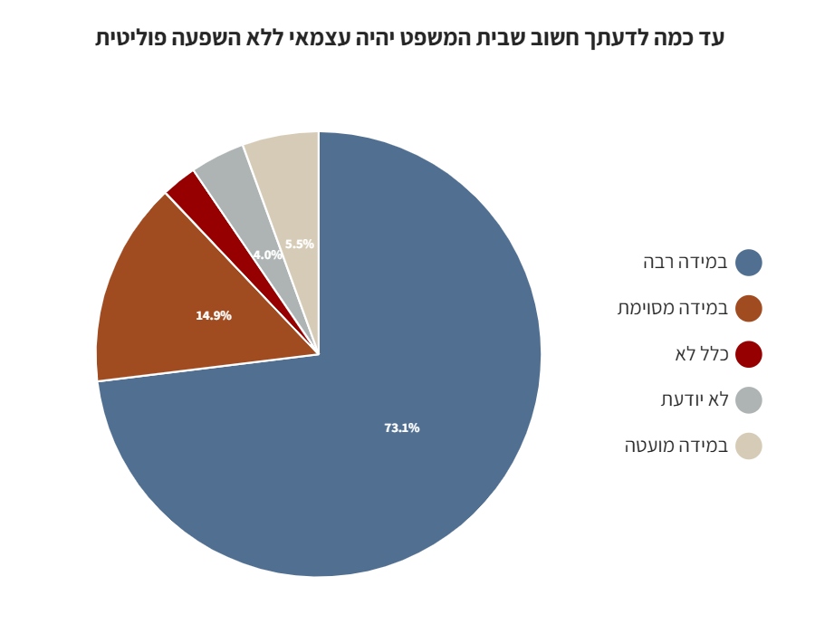 כמעט 90% מהנשאלים השיבו כי חשוב בעיניהם (במידה רבה או מסוימת) שבית המשפט יהיה עצמאי ללא השפעה פוליטית.